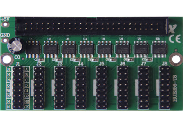 在制作中大面積顯示屏時,建議從電源端引線對HUB板直接供電,以充分保障HUB板的輸出信號質量。對于超長LED顯示屏的信號級聯(lián)能力將大有好處!