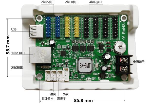 ⑴ 板載亮度/溫度/溫濕度傳感器接口、紅外遙控頭接口、RS485環(huán)境傳感器接口;(BX-6MT/6A系列除外)