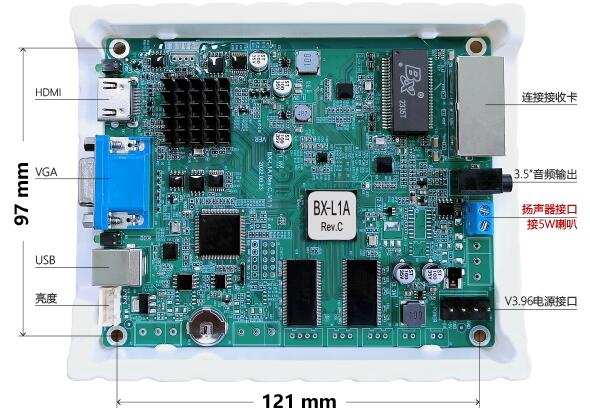 BX-L1A是一款板卡型的視頻控制器。板載HDMI輸入接口和VGA輸入接口,其功能和性能指標(biāo)相當(dāng)于OVP-K2,方便在LED顯示屏內(nèi)(狹小空間范圍)與各種安卓盒子、智慧網(wǎng)關(guān)、工業(yè)主板等配套應(yīng)用。