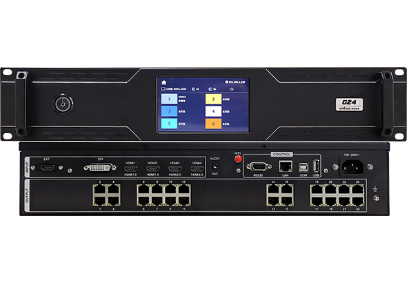 OVP-G24 六畫面LED拼控一體設備滿足8K×2K超高分辨率輸出。設備集成24千兆網口大發送,支持6畫面顯示,支持高動態范圍HDR10視頻源輸出,提供超清晰沉浸視覺體驗。支持LED顯示屏的遠程維護。