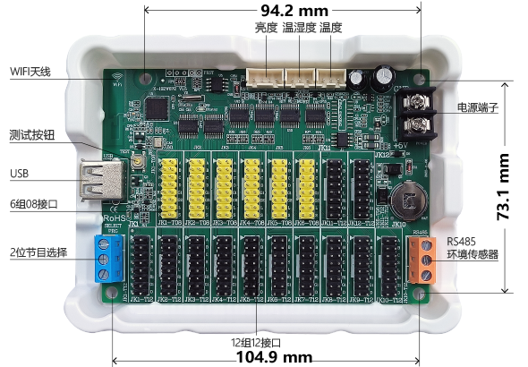 ⑹ X-128W全功能版標(biāo)配溫度、溫濕度、亮度傳感器接口,標(biāo)配2位節(jié)目開關(guān)和RS485環(huán)境傳感器接口。