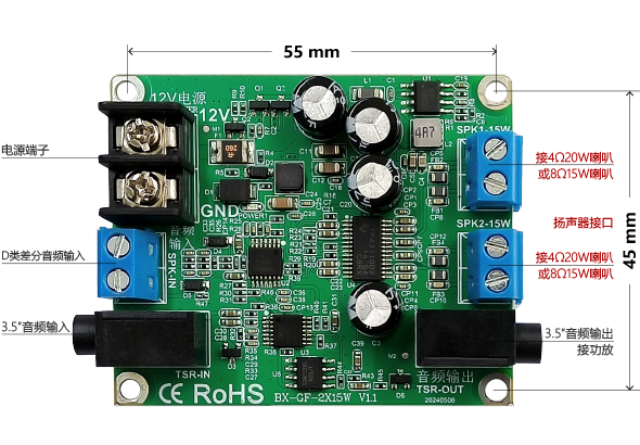 支持雙路15W喇叭輸出,支持3.5mm音頻座模擬輸入,可接Y系列播放器等有3.5mm音頻座模擬輸出的設備。支持D類差分輸入,可接具有喇叭輸出接口的控制卡。安裝使用方便,抗震動能力強。